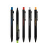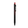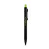 Bolígrafo metálico retráctil con cuerpo negro acabado mate, clic de color metalizado al igual que el fondo del cuerpo cuando se realiza grabado láser. Tinta Azul.
