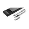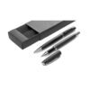 SET: Bolígrafo metálico sistema de apertura medio giro. Roller sistema de apertura con capuchón. Clip, puntera y detalles en color plata. Presentación: Estuche de cartulina con tapa de apertura deslizable. Medidas estuche: 18 x 6 x 2 cm