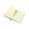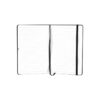 Cartón. 21 x 14 x 1,5 cm. Tamaño similar a A5. 80 páginas rayadas. Separador de hojas en tela. Cierre con banda elástica. Bolsillo interior en la parte trasera de la libreta.
