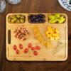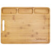 43 x 32 x 1.8 cm. Tabla de corte en Bambú. Tres compartimentos para armar picadas y llevarlas directo a la mesa. Transportable con manija incluida. Presentación en caja de regalo.